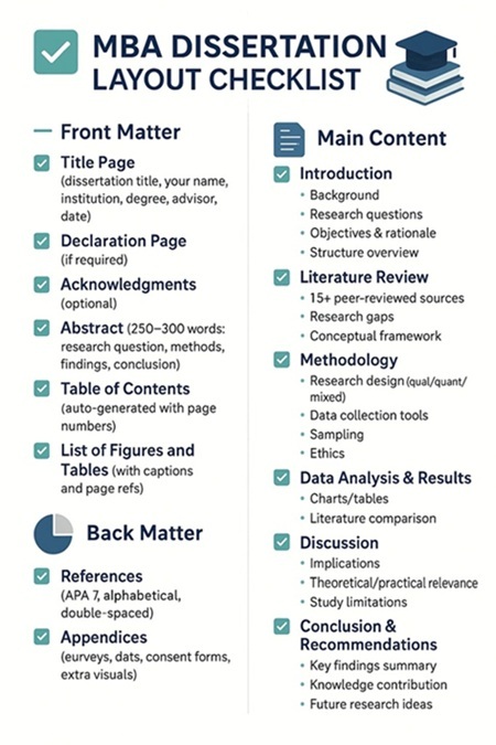 Download or refer to our MBA Dissertation Layout Checklist infographic for a visual breakdown of each section – from title page to appendices.
